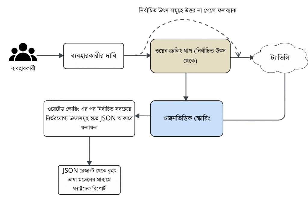 প্রাথমিকভাবে অনুসন্ধান সীমাবদ্ধ থাকে কিউরেটেড উৎসগুলোর মধ্যে। তবে যদি এমন কোনো দাবি আসে যা অত্যন্ত নতুন বা অস্বাভাব্য, তখন সেই উৎসগুলোর মধ্যে মিল পাওয়া নাও যেতে পারে। সেই ক্ষেত্রে ফলব্যাক অনুসন্ধান প্রক্রিয়া সক্রিয় হয়। এখানে ব্যবহৃত হয় একটি বিশেষ টুল, যেমন ট্যাভিলি এপিআই — যা পুরো ওয়েব-স্পেস স্ক্যান করে, তবে শুধুমাত্র বিশ্বস্ত ও অথেন্টিক সাইট থেকে তথ্য সংগ্রহ করে।